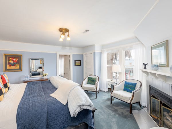 Gorgeous and Grand - The Great Point Room features a beautiful zinc metal King bed, an intimate sitting area and gas fireplace. This room, located on the second floor, has a private bath with a modern vanity, deep clawfoot tub and rain shower. Additional amenities include HD DirecTV, music player, luxurious spa bathrobes, shampoo, conditioner and body lotion. Beautiful artwork and artifacts complete the beach decor of this room. Rate includes breakfast in the Dining Room and complimentary wine bar in the evening.
