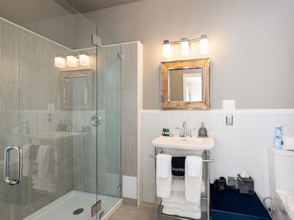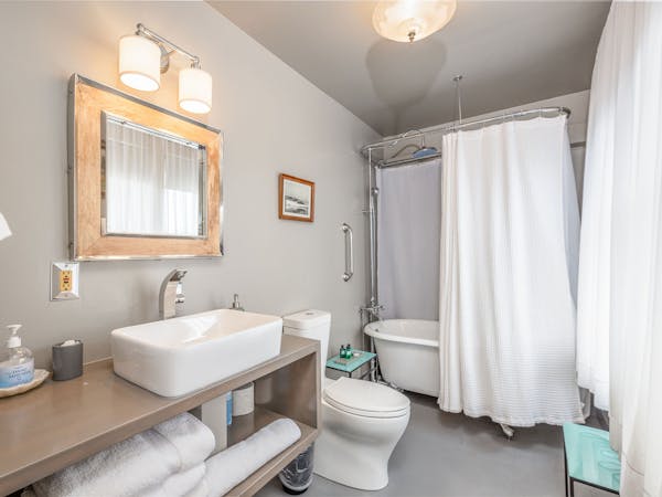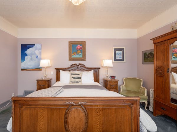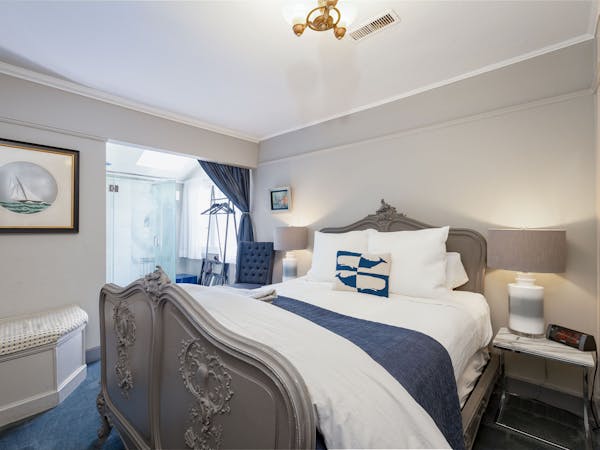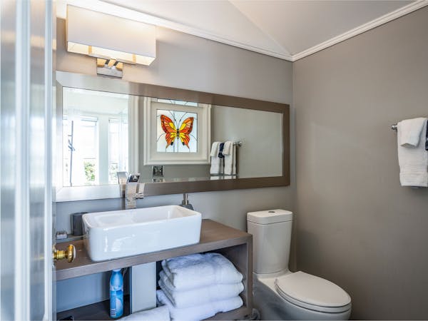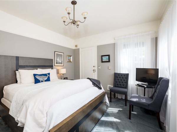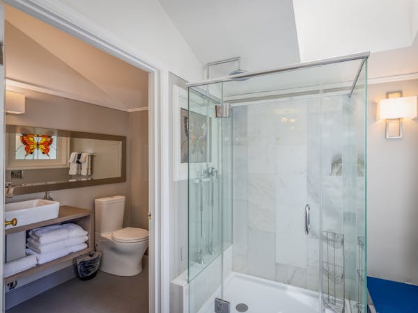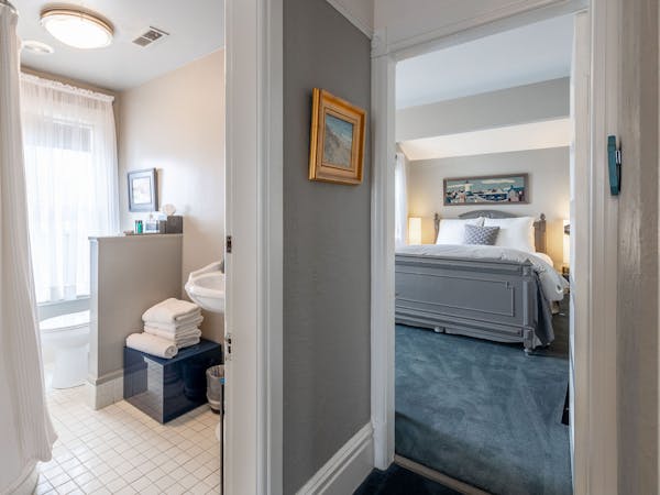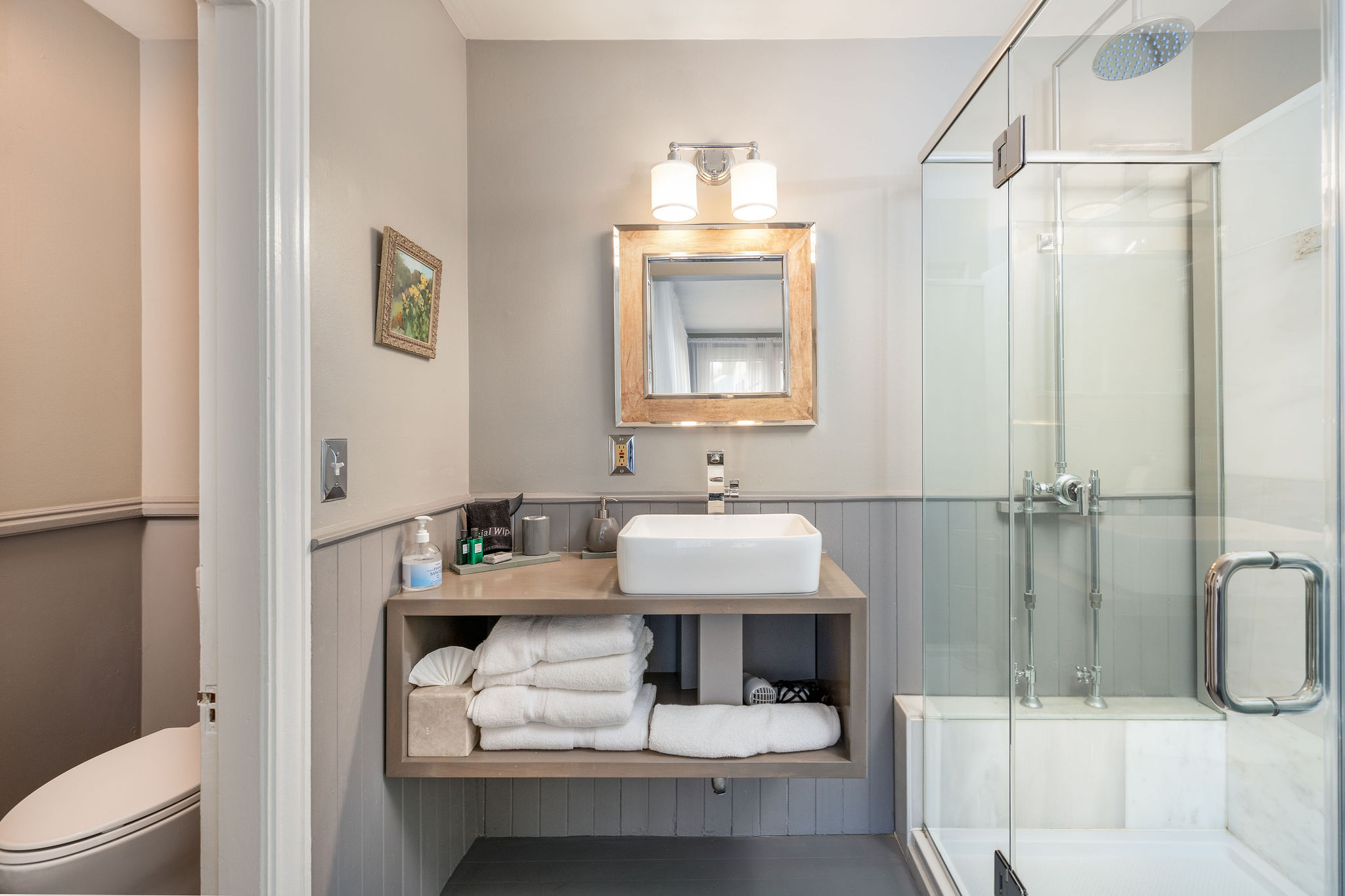 Bright and Breezy – The Light Ship Room, located on the second floor, has two walls of windows overlooking the courtyard and garden, making this the brightest room in the house. The room features a beautiful zinc metal Queen bed, walk-in glass rain shower and modern vanity. Additional amenities include HD DirecTV, music player, luxurious spa bathrobes, shampoo, conditioner and body lotion. Rate includes breakfast in the Dining Room and complimentary wine bar in the evening.