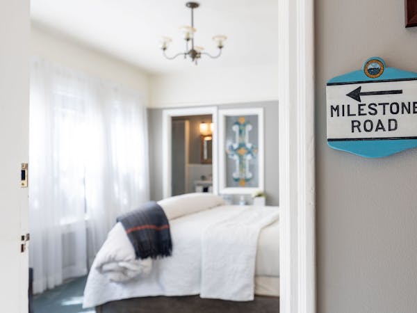 Relaxed Elegance – The Milestone Road Room features a beautiful Queen bed, windows facing our courtyard garden area and a private bath, that was just renovated, with a walk-in shower. Located on the first floor, this quiet respite’s amenities include HD DirecTV, music player, luxurious spa bathrobes, shampoo, conditioner and body lotion. Rate includes breakfast in the Dining Room and complimentary wine bar in the evening.