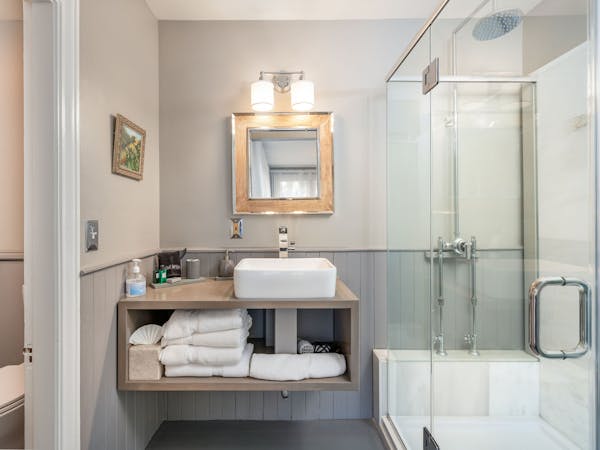 Simply Enchanting – The Siascoset Room (pronounced Sconset), on the second floor, has a Queen bed, walk-in glass rain shower under skylight alcove and modern vanity. Additional amenities include HD DirecTV, music player, luxurious spa bathrobes, shampoo, conditioner and body lotion. Rate includes breakfast in the Dining Room and complimentary wine bar in the evening.