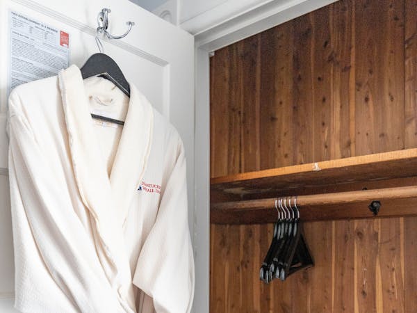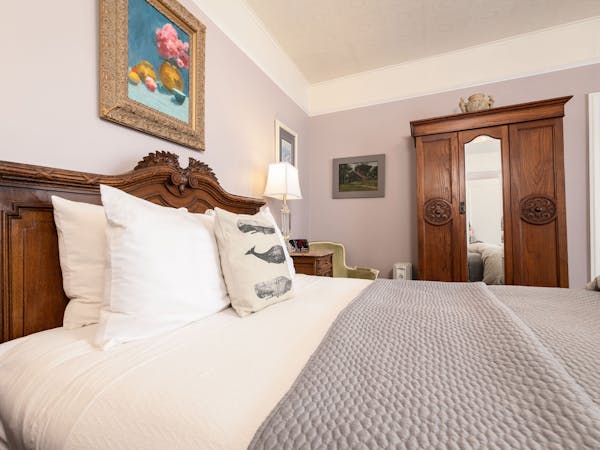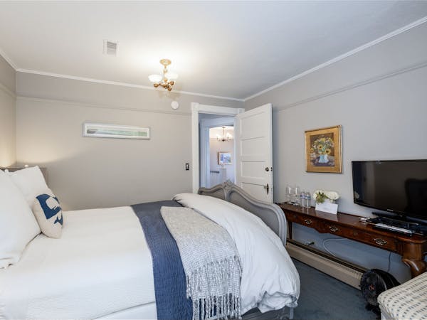 Comfortable & Cozy – The Miacomet Room is our smallest and most affordable room. It features a Queen bed and sitting area and is located on the second floor. It has a separate, private bath with bath tub and shower, located just outside the door in the room adjacent to the bedroom. Additional amenities include HD DirecTV, music player, luxurious spa bathrobes, shampoo, conditioner and body lotion. Rate includes breakfast in the Dining Room and complimentary wine bar in the evening.