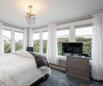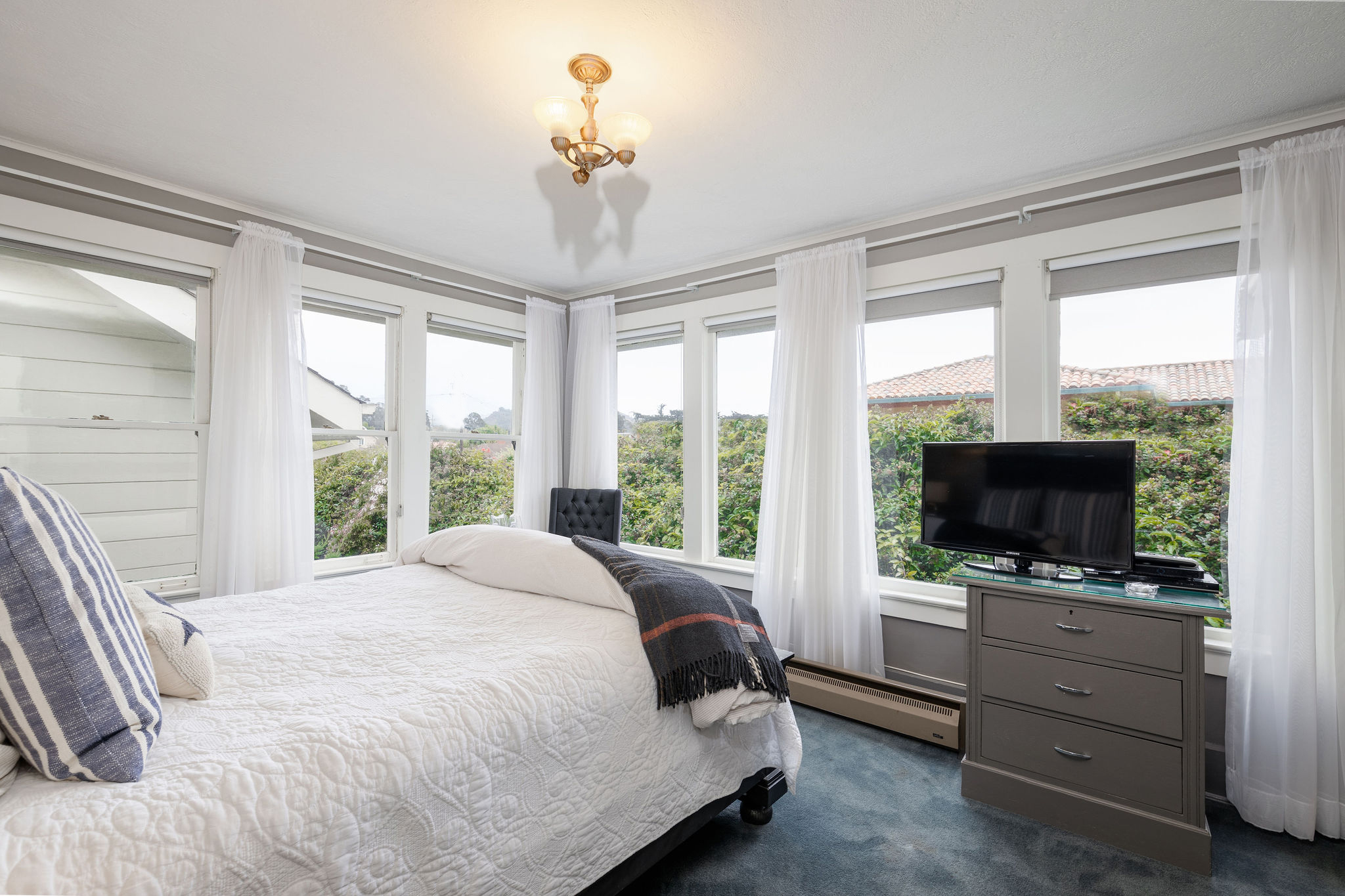 Bright and Breezy – The Light Ship Room, located on the second floor, has two walls of windows overlooking the courtyard and garden, making this the brightest room in the house. The room features a beautiful zinc metal Queen bed, walk-in glass rain shower and modern vanity. Additional amenities include HD DirecTV, music player, luxurious spa bathrobes, shampoo, conditioner and body lotion. Rate includes breakfast in the Dining Room and complimentary wine bar in the evening.