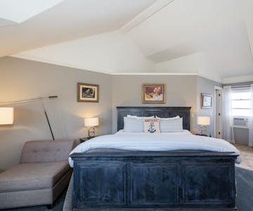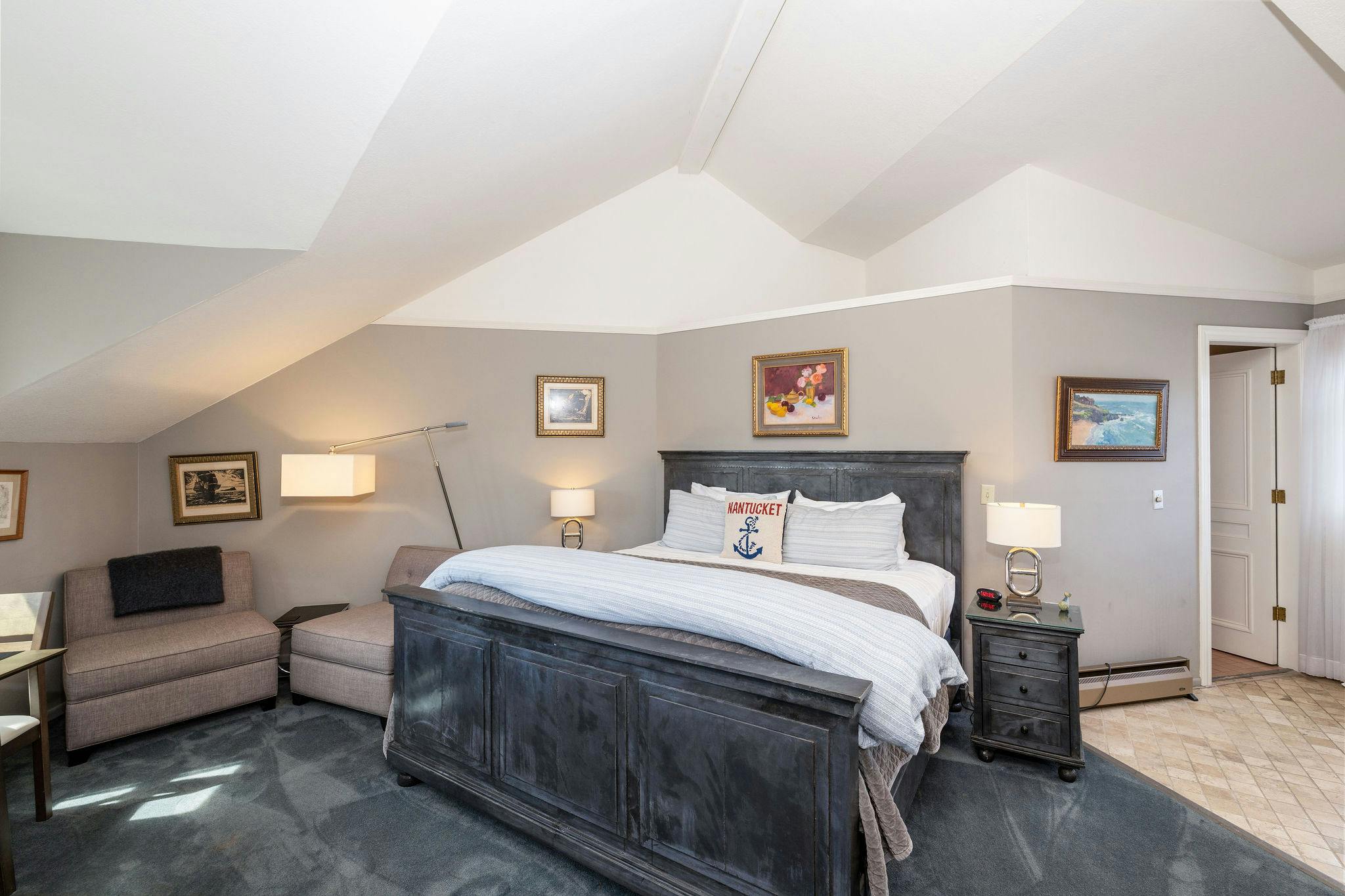 The room features a beautiful zinc metal King bed, a sitting area and a cathedral ceiling. There is a whirlpool tub with jets and rain shower beneath a skylight. You’ll have your own refrigerator and coffee maker with a selection of teas and our Nantucket Blend organic coffee. Additional amenities include Air Conditioner, HD DirecTV, music player, luxurious spa bathrobes, shampoo, conditioner and body lotion. . Rate includes breakfast and complimentary wine bar in the evening. Plus breakfast is served in your room upon request …truly extravagant!