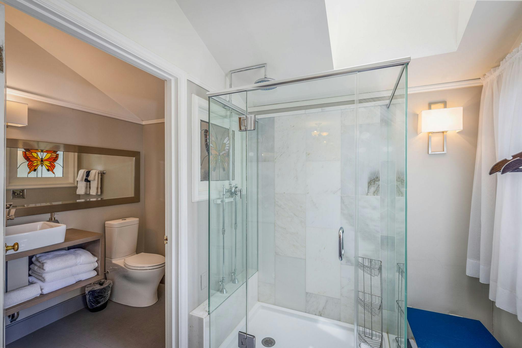 Simply Enchanting – The Siascoset Room (pronounced Sconset), on the second floor, has a Queen bed, walk-in glass rain shower under skylight alcove and modern vanity. Additional amenities include HD DirecTV, music player, luxurious spa bathrobes, shampoo, conditioner and body lotion. Rate includes breakfast in the Dining Room and complimentary wine bar in the evening.